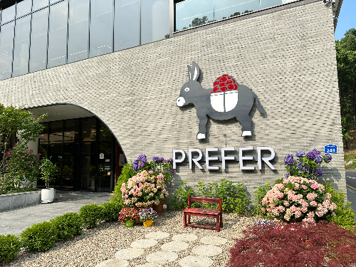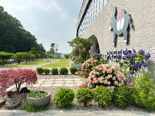 주차장 바로 옆이 프리퍼 카페 입구예요. 카페 건물 앞에는 푸른 잔디와 예쁜 꽃들로 꾸며져 있답니다.